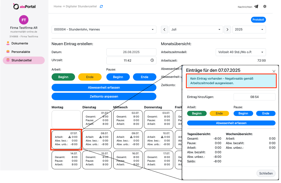 Hinweis: Seit der absPortal-Version 17.13 (Stand Ende Dezember 2025) ist es auch möglich, die Abwesenheiten direkt in einem Tag zu erfassen. Wählen Sie dafür einen Tag, für den noch eine Abwesenheit ergänzt werden muss. Im folgenden Bild wurde beispielhaft der 07.07.25 gewählt.
