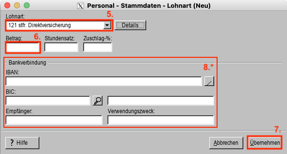 8.* Die Angaben für die Bankverbindung, den Empfänger und der Verwendungszweck können nur bei bestimmten Lohnarten erfolgen. Wenn die Felder angezeigt werden, sollten Sie diese auch ausfüllen, z.B. bei einer Direktversicherung oder bzgl. VWL-Leistungen, so dass diese Informationen auch auf der Zahlungsliste mit angedruckt werden können.