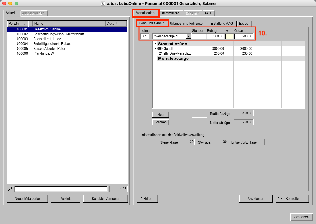 9. Die erfassten Lohnarten werden bei Ihrem Mitarbeiter ab dem aktuellen Zeitraum in den Stammdaten hinterlegt und monatlich so abgerechnet. Bei Bedarf kann der Betrag pro Lohnart (und ggf. die anderen Informationen) mit einem Doppelklick auf die jeweilige Zeile in der Tabelle auch geändert werden.