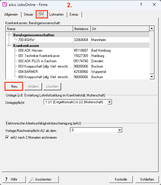 Sie finden die Krankenkassen im Firmenstamm unter dem Register "SV". Hier können Sie die bestehenden Krankenkassen bearbeiten oder neue Kassen anlegen.