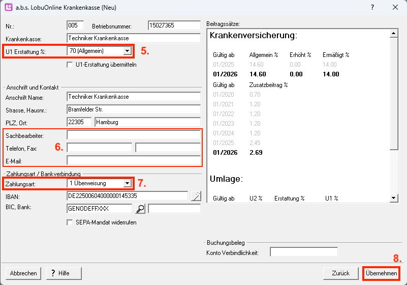 8. Nachdem die Daten ergänzt wurden, klicken Sie auf die Schaltfläche "Übernehmen". Die Krankenkasse wurde nun erfolgreich im Firmenstamm angelegt.