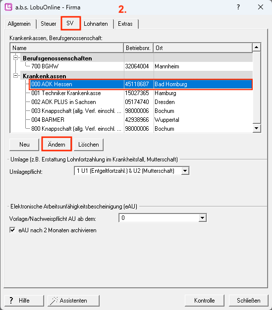 2. Navigieren Sie danach in das Register "SV", markieren die entsprechende Krankenkasse und klicken dann auf die Schaltfläche "Ändern" (alternativ Doppelklick auf die Kasse).