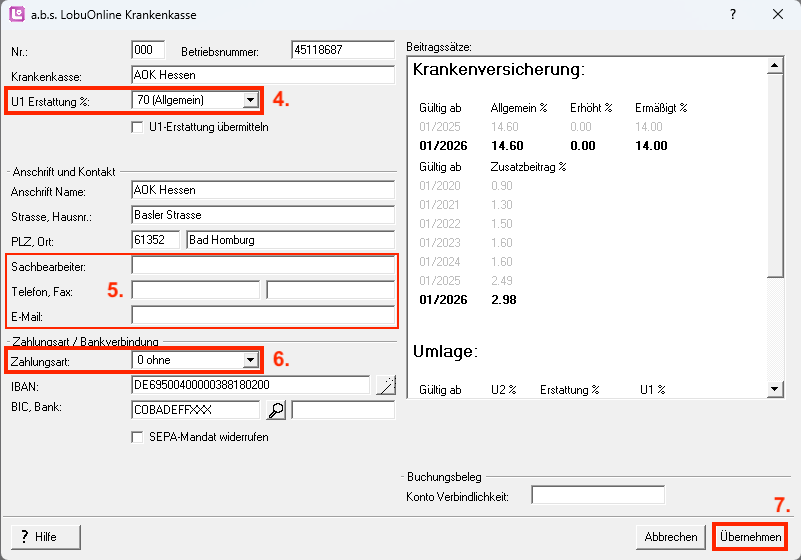 7. Nachdem die Daten ergänzt wurden, klicken Sie auf die Schaltfläche "Übernehmen". Die Krankenkasse wurde nun erfolgreich im Firmenstamm angepasst.