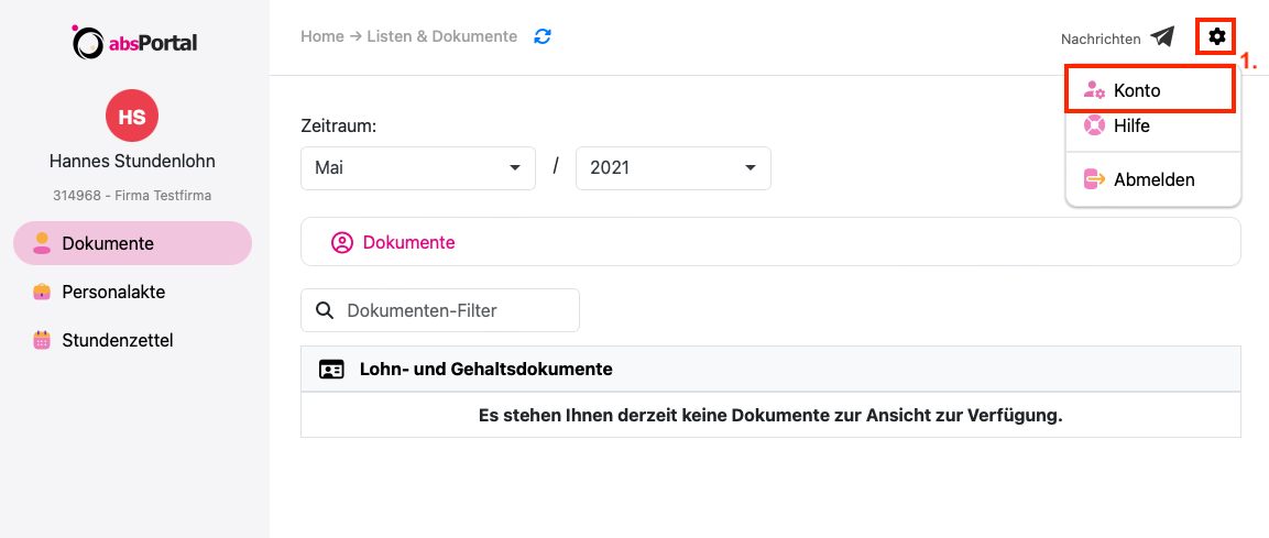 1. Wählen Sie im Menü "Einstellungen" (Symbol oben rechts auf der Seite) die Option "Konto" aus.
