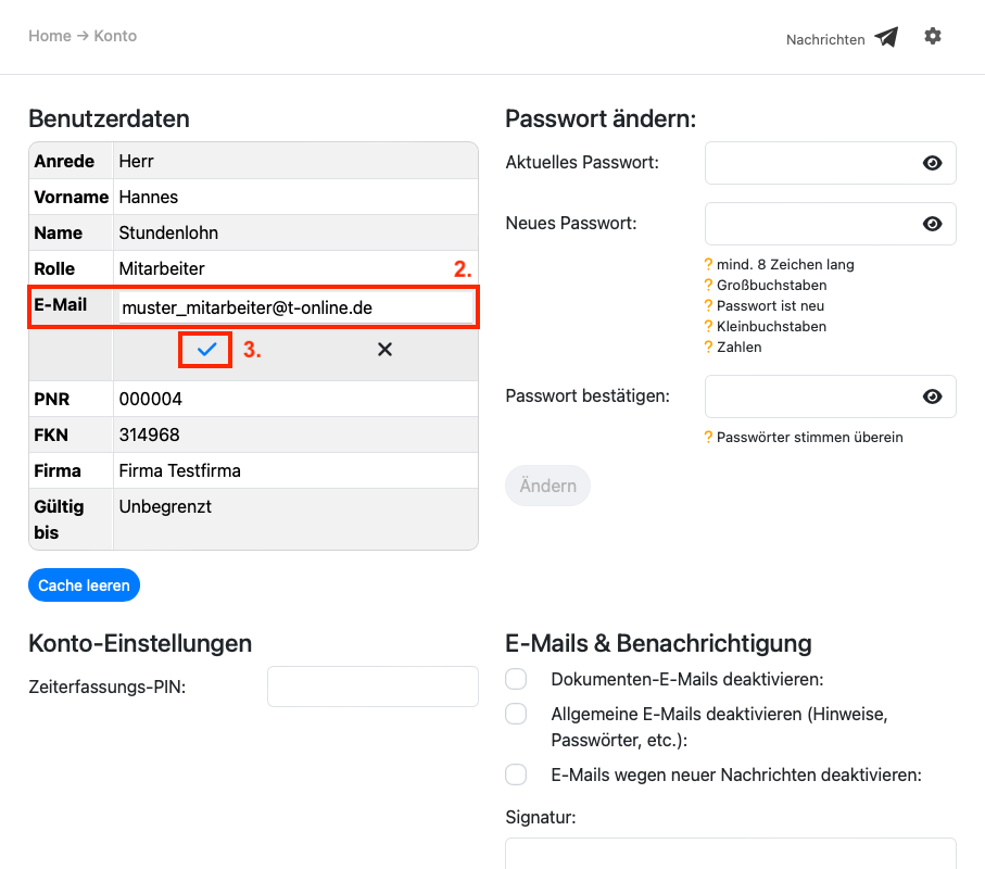 2. Klicken Sie in das Feld "E-Mail" und tragen hier Ihre E-Mailadresse ein, an die Sie Benachrichtigungen vom Portal (z.B. Nachrichten von Ihrem Arbeitgeber, Benachrichtigung, dass neue Lohndokumente zur Verfügung stehen) erhalten möchten.