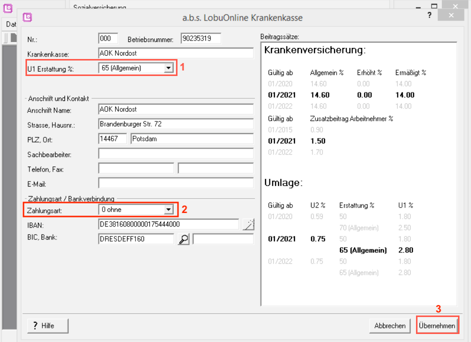 1. Stellen Sie danach den "U1 Erstattungssatz %" ein, den Sie mit der Krankenkasse vereinbart haben. In der Regel ist hier der Erstattungssatz mit dem Kennzeichen "Allgemein" einzutragen.