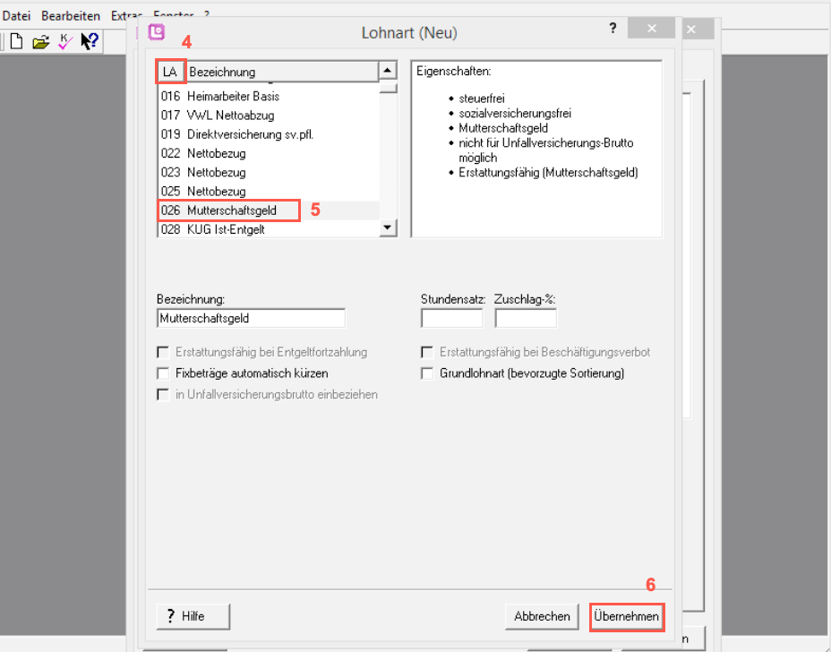 5. Markieren Sie die Lohnart "026 Mutterschaftsgeld".