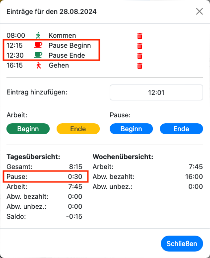 Hat der Mitarbeiter eine Pause gestempelt, die jedoch kürzer als das gesetzliche Minimum ist (z.B. 15 Minuten), passt das System die Pause auf das gesetzliche Minimum von 30 Minuten an.
